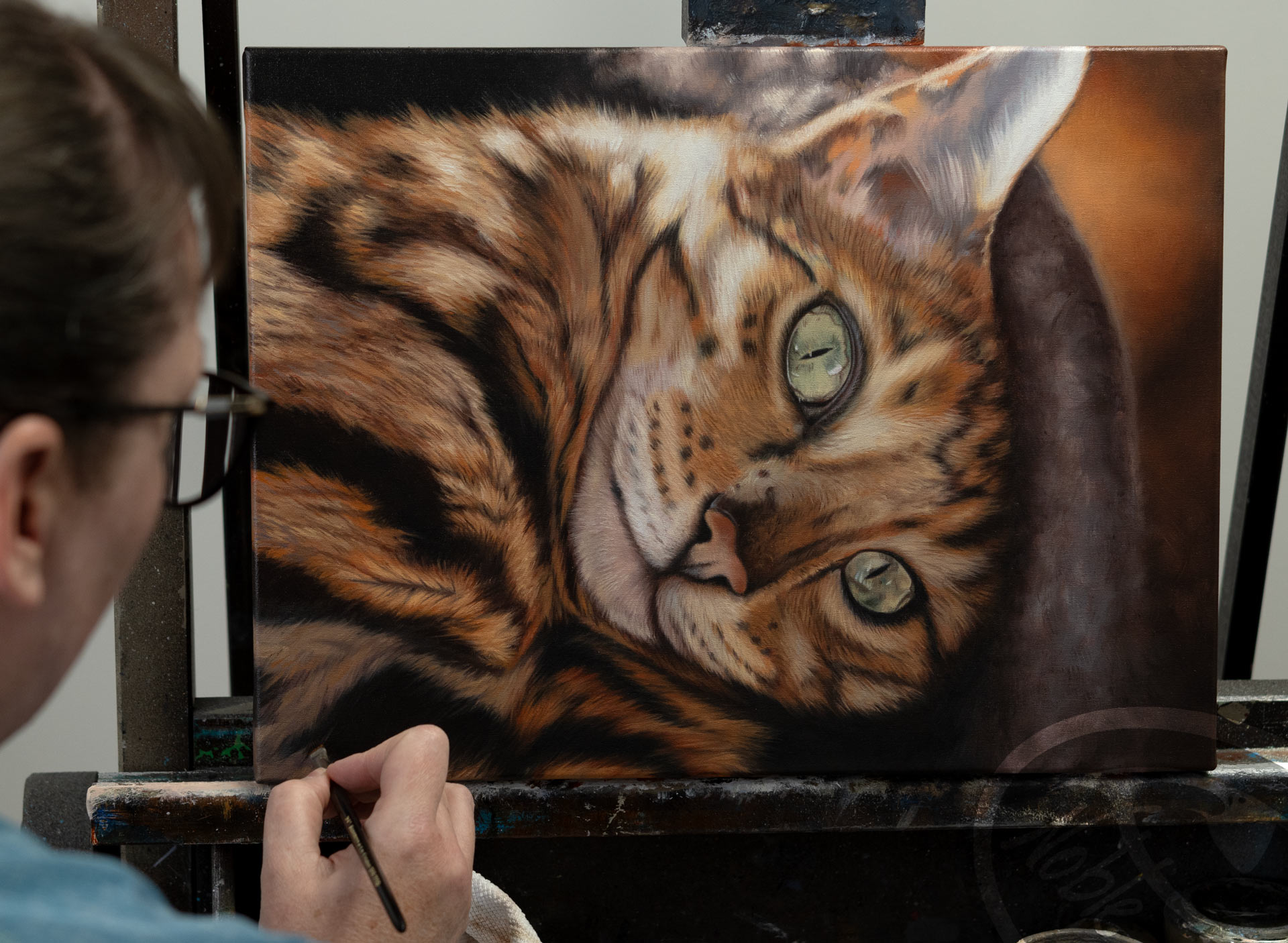 Ce petit format aux couleurs chaudes fait vibrer la lumière dans la douceur de son pelage, révélant toute la délicatesse de cette jolie dame. Il ne s’agit pour l’instant que de la première couche, mais j’ai déjà hâte de poursuivre et de lui apporter toute la richesse de détails et de nuances qu’elle mérite.
